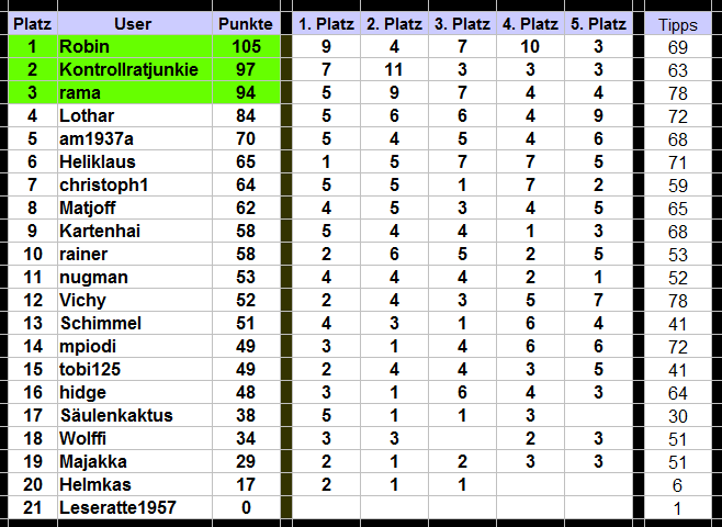 Robin schafft als erster in diesem Jahr die 100 Punkte und hält Platz 1. Unser kartenhai wird so langsam wach und rollt das Feld von hinten auf.