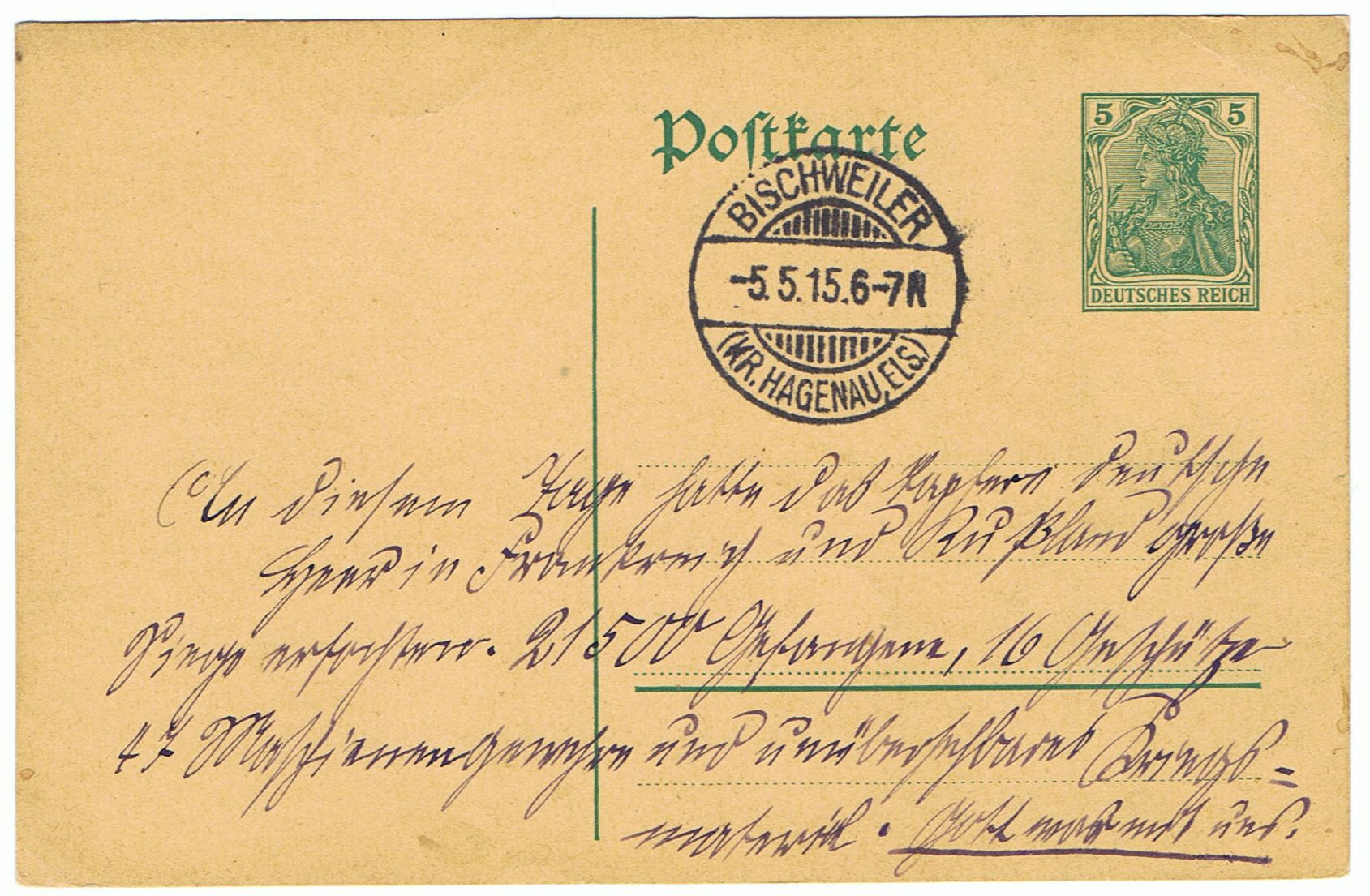 Gestempelt mit Poststempel Bischweiler (Kr. Hagenau, Els.) vom 05.05.1915 und verwendet wurde eine Germania-GS.