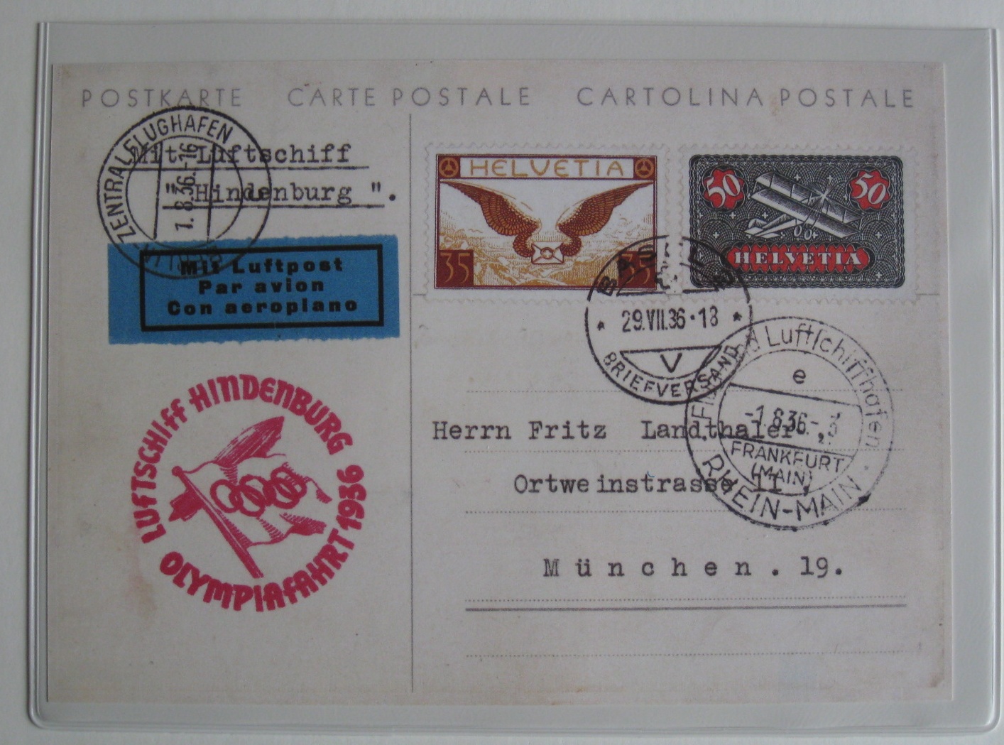 Herzlichen Glückwunsch! Das ist nicht irgendeine "Postkarte von 1936" sondern eine Schweizer Zuleitung zur Olympiafahrt 1936 des Luftschiffs "Hindenburg". Während deutsche Karten und Briefe von dieser Fahrt häufig zu sehen sind, gilt dies nicht für Schweizer Belege: die sind ausgesprochen selten.