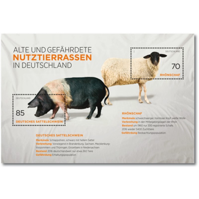 Auf dem am 1.9. verausgabten neuen deutschen Block: Alte und gefährdete Nutztierrassen in Deutschland (Block 81) ist neben einem Sattelschwein auch ein Rhönschaf zu sehen: