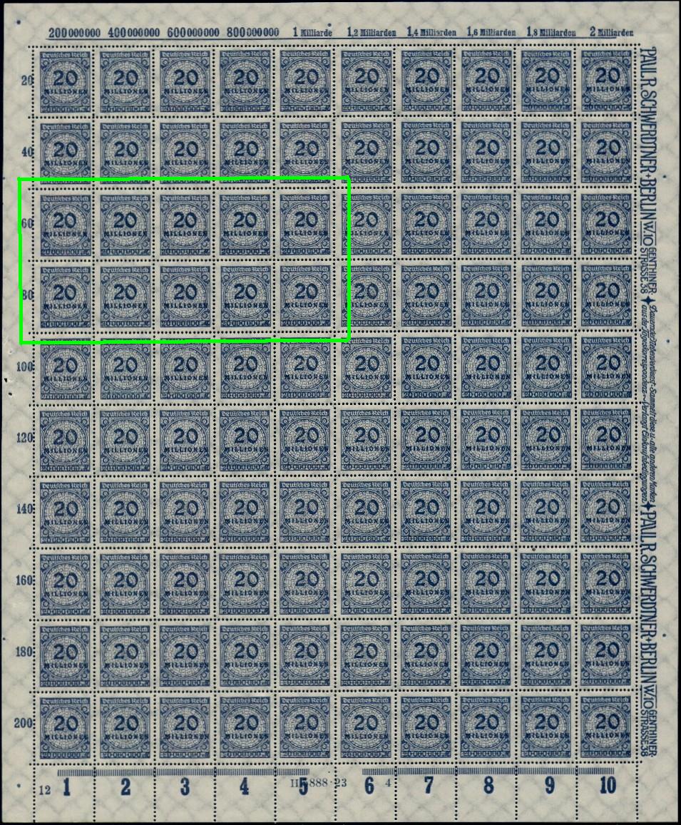 Hallo zusammen, Heute möchte ich einen Bogen der 319 A P - Platte C zeigen mit dem Plattenfehler - enge 20 auf Feld 21-25 und 31-35 - auf dem Detailbild gut zu erkennen. Gruß achim58