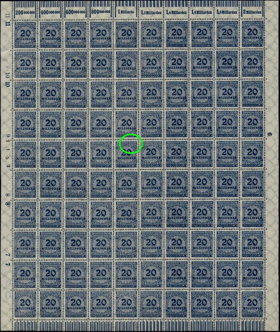 Dieser Plattenfehler kommt auch bei der Nr 299 (400Tausend auf 30 Pfg) auf dem gleichen Feld vor.