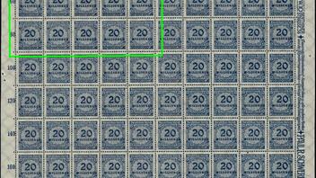 Hallo zusammen, Heute möchte ich einen Bogen der 319 A P - Platte C zeigen mit dem Plattenfehler - enge 20 auf Feld 21-25 und 31-35 - auf dem Detailbild gut zu erkennen. Gruß achim58