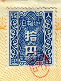 Ich nehme mal an, es handelt sich um eine japanische Fiskalmarke. Auf den insgesamt 6 ähnlichen Belegen, die mit einer Klammer zusammengeheftet sind, befinden sich jeweils 4 – 6 kleine rote Stempel, einer davon immer auf der Marke. Der Beleg ist auf der linken Seite gezähnt, wie von einem Abreißblock.