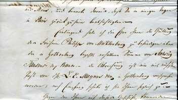 Ich habe heute Ihr Werthes vom 16. erhalten aus Mons, und bemerke daraus, dass Sie in einigen Tagen in Paris zurück zu sein beabsichtigten. Einliegend habe ich die Ehre, Ihnen die Quittung des Freiherrn Philipp von Mecklenburg zu behändigen über die in Gothenburg bezahlt erhaltene Summa von sechzigtausend (? Währung) banco. Die Abrechung ist mir mit nächster Post von ? L. E. Magnus ? in Gothenburg versprochen worden; nach Empfang schicke ich sie Ihnen sogleich zu.