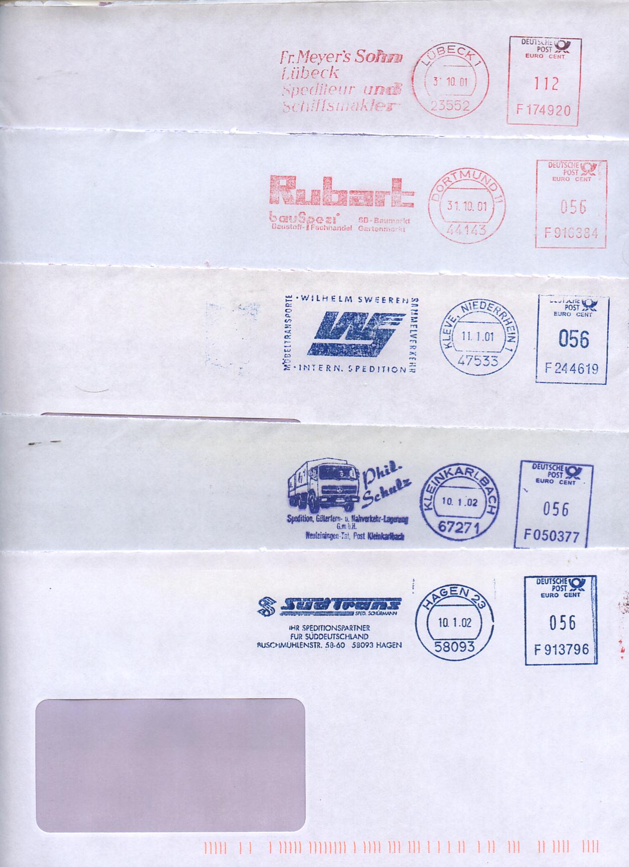 2) 5 stellige Frankaturen, denn das waren Frankierwerke für Großfirmen, die bis 999,00 DM/Euro frankieren können, wogegen eine normale FM bei 9,99 aufhört. ( Bei einigen Pitney Bowes Maschinen konnte man noch die 1 davorschalten, aber bis höchstens 10,99, dann war Ende und es musste ein zusätzlicher Frankierstreifen her.