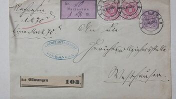 Ein Nachnahme Dienstbrief von Ellwangen nach Westausen möchte ich heute zeigen. Als Ganzsache Dienst 5 Pf mit je 10 Pf als Paar der ersten Dienstausgabe vom 24.09.1883.