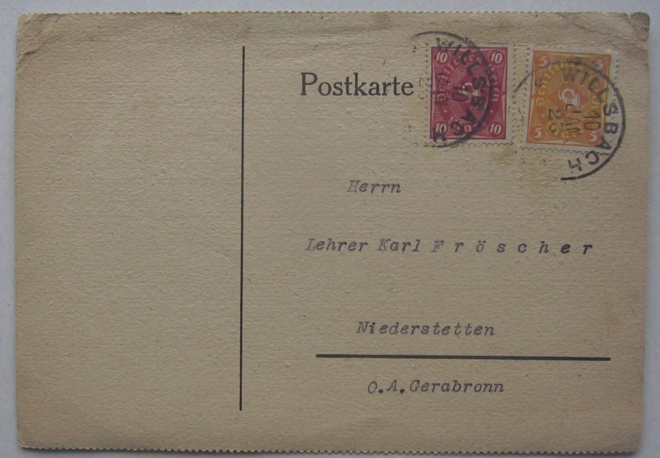 Obwohl nicht vom März stellle ich meine nächste Karte auch hier vor. Diese ist vom 10.01.1923 von Willensbach nach Niederstetten gelaufen und frankiert mit einer 5 und 10 Mark Marke zweifarbig jeweils.