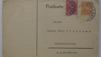 Obwohl nicht vom März stellle ich meine nächste Karte auch hier vor. Diese ist vom 10.01.1923 von Willensbach nach Niederstetten gelaufen und frankiert mit einer 5 und 10 Mark Marke zweifarbig jeweils.