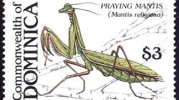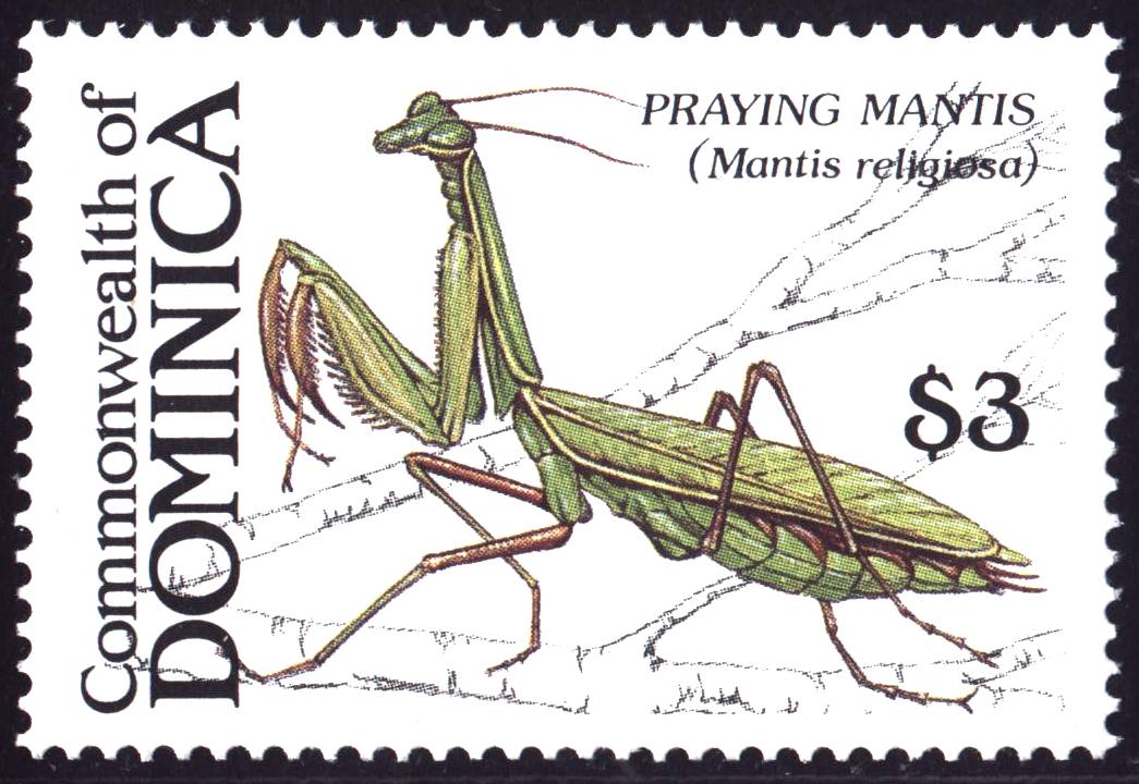 Das zweite Exemplar zeigt Mantis religiosa auf Mi.-Nr: 1184 (?) aus dem Commonwealth of Dominica, als postfrische Marke.