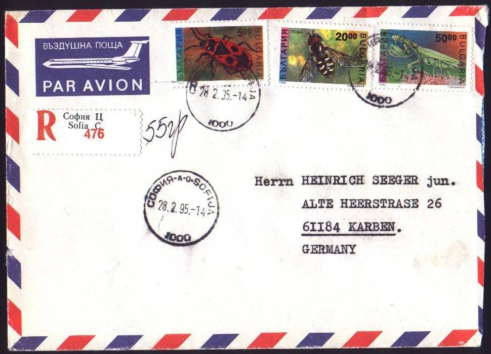 heute möchte ich einen weiteren Beleg mit einer Gottesanbeterin zeigen. Es handelt sich um die gleiche Art, die Europäische Gottesanbeterin. Hier ist sie auf der Mi.-Nr: 4017 von 1992 aus Bulgarien, auf einem Luftpostbrief (vom 28.02.1995) von Sofia nach Deutschland zu sehen.