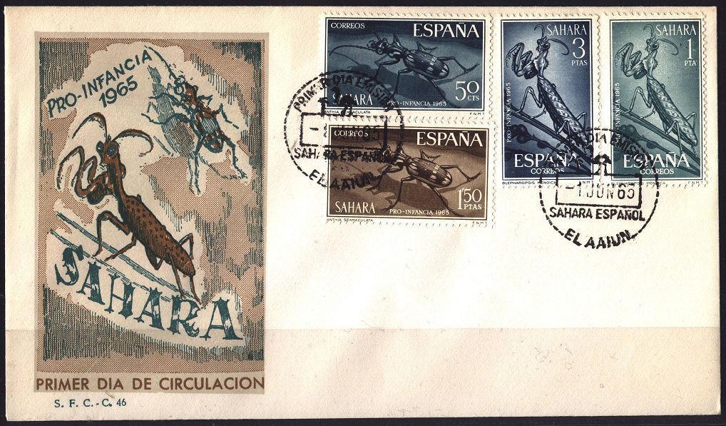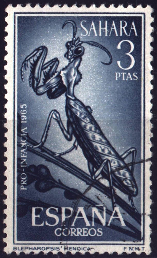 Am 01.Juni 1965 wurden in Spanisch-Sahara, einer spanischen Kolonie in Nordwestafrika (sie bestand von 1884 - 1975), der Satz Mi.-Nr: 273 - 276 verausgabt, der hier auf einem wunderschönen FDC enthalten ist. Die beiden Einzelmarken (Mi.-Nr: 274 und 276) habe ich zusätzlich noch einmal vergrößert dargestellt. Daz noch eine Abbildung eines ausgewachsenen Männchens (Quelle: siehe Bild)