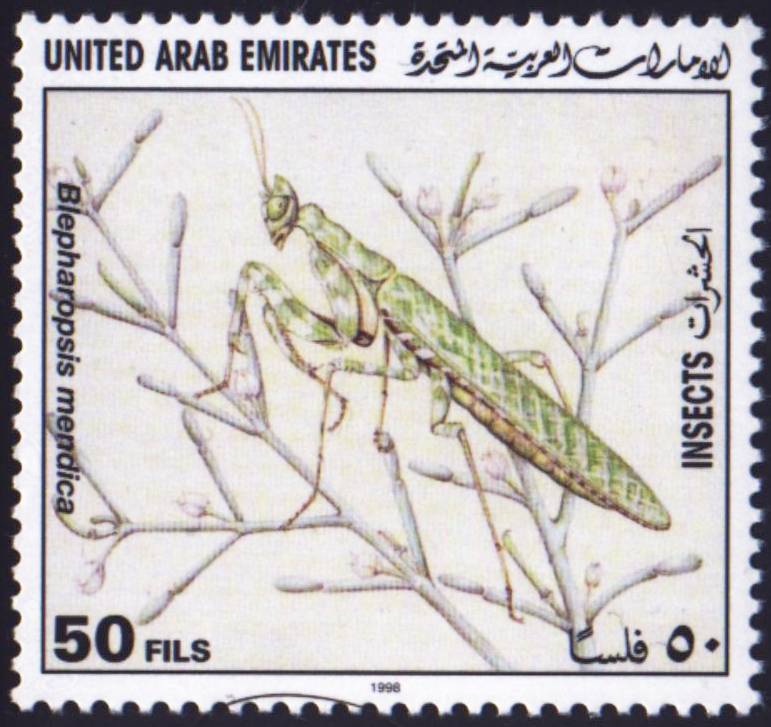 heute und in den nächsten Tagen werde ich Euch meine neuesten Errungenschaften vorstellen. Größtenteils sind auf dem Marken allerdings Gottesanbeterinnen-Arten, die aus früheren Posts schon bekannt sind, so auch in diesem Fall. Hier zeige ich Euch die Kleine Teufelsblume Blepharopsis mendica auf Mi.-Nr: 571 von 1998 aus den Vereinigten Arabischen Emiraten. Es handelt sich um den kleinsten von vier Werten des Satzes Insekten und Spinnen.