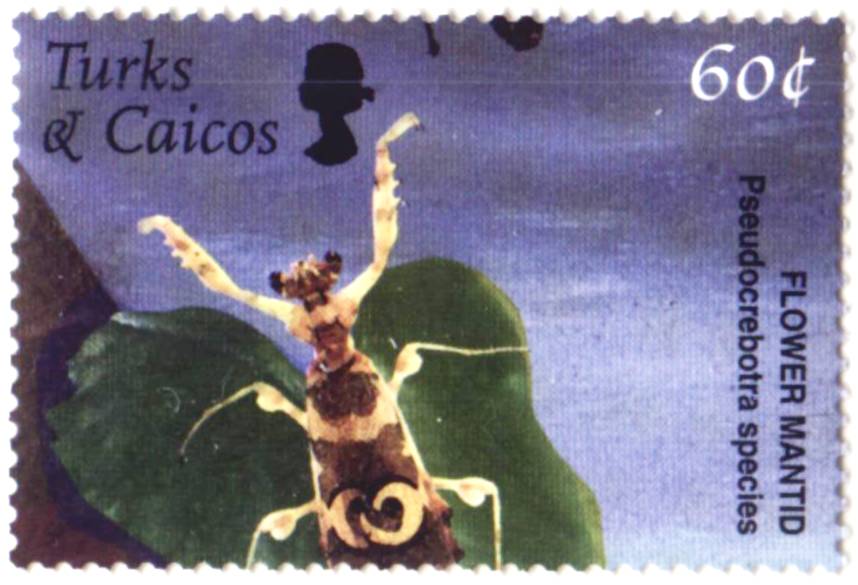 Vielen Dank zunächst für Deine Recherche. Ich habe auch ein wenig nachgeforscht und herausgefunden, dass in den Jahren 1999 und 2000 in Madagaskar eine ganze Reihe von Vignetten verausgabt wurden, die wie Briefmarken aussehen, aber keine Frankaturgültigkeit hatten. Es ist ohne Weiteres möglich, dass es sich heirbei auch um einen Block solcher Vignetten handelt.An dieser Stelle möchte ich wieder eine meiner neuesten Errungenschaften zeigen. Von Turks & Caicos wurde im Jahre 2002 ein Insektensatz mit 6 Werten (1705 - 1710) verausgabt, der gleich zwei Gottesanbeterinnen birgt. Es handelt sich um die weiter oben bereits beschriebene Art Pseudocreobotra wahlbergii und um eine ihr sehr ähnliche Art der Gattung Creobotra, die als Blütenmantis bekannt sind (Mi.-Nr: 1709 und 1710).