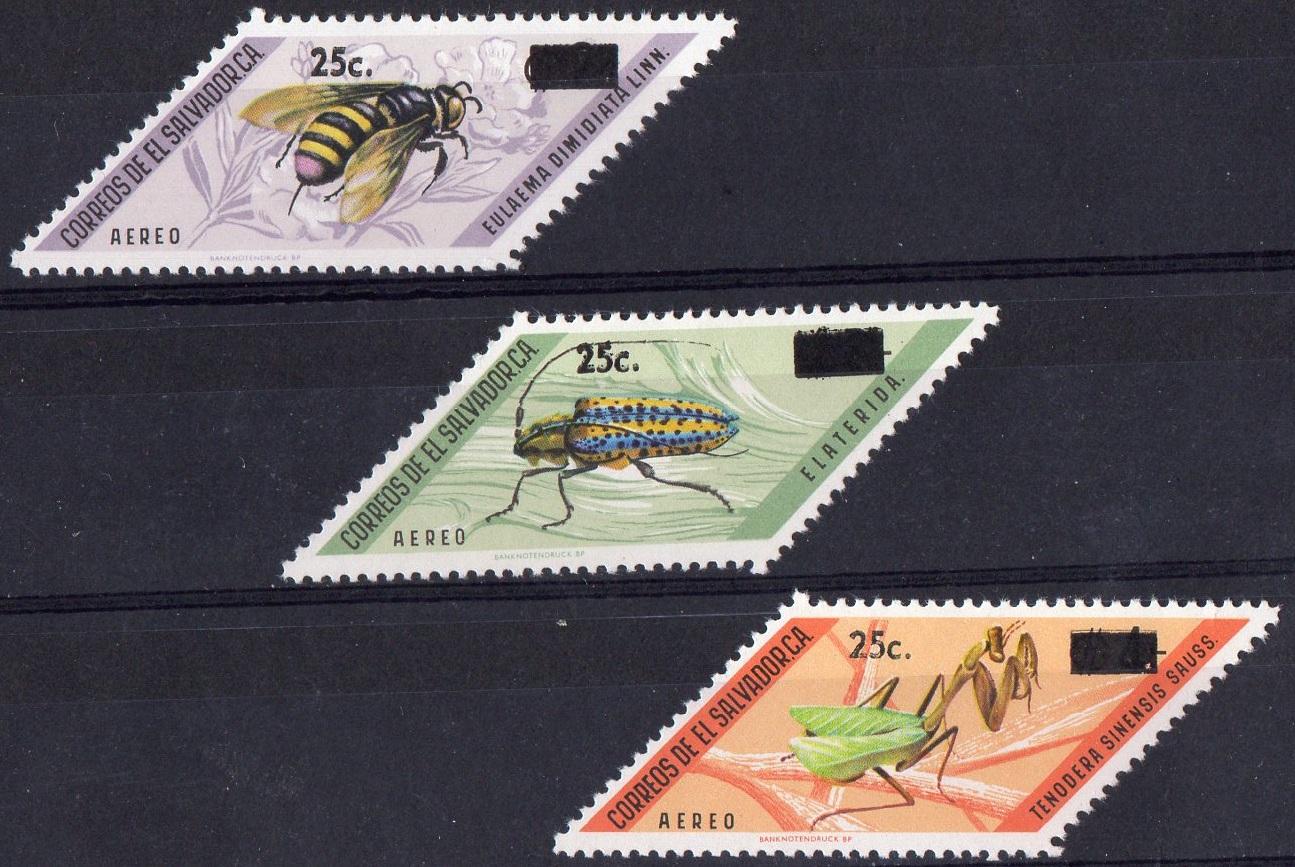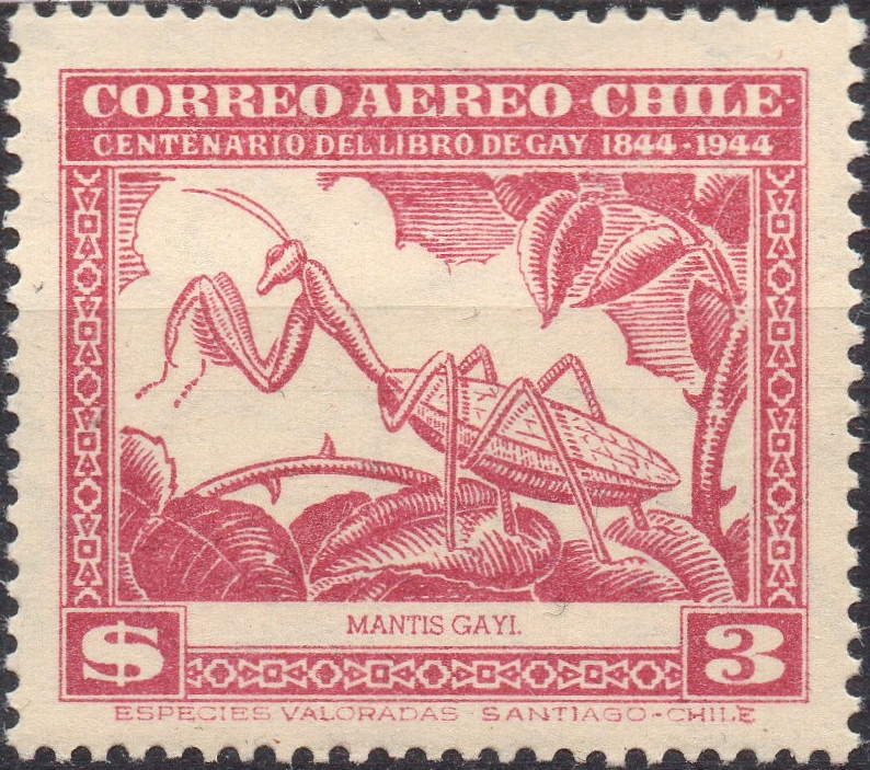 Abgebildet ist auf allen drei Mantiden-Marken Coptopteryx gayi (früher Mantis gayi).