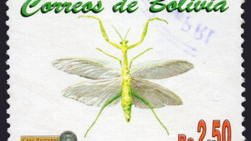 Die wohl am häufigsten auf Marken dargestellte Mantide ist die Europäische Gottesanbeterin Mantis religiosa. So findet man diese Artauch auf Marken ferner Länder, wie in diesem Fall auf der Mi.-Nr. 1491, die am 30.08.2001 als zweiter von sechs Werten in Bolivien verausgabt wurde. Hier ist besonders interessant, dass die Mantis mit geöffneten Flügeln, betrachtet von der Bauchseite dargestellt wurde. So indet man sie eher in einer biologischen Sammlung auf einer Insektennadel.