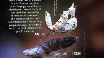 2020 erschienen in Gambia 3 Werte und ein Block mit Gottesanbeterinnen. Die 3 Werte wurden als Einzelmarken katalogisiert, obwohl sie in einem Block oder Kleinbogen zusammengefasst verkauft wurden. Gambia gab bereits früher einmal einen Insekten-Block heraus, in dem links unten eine Gottesanbeterin zu sehen ist: