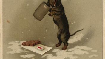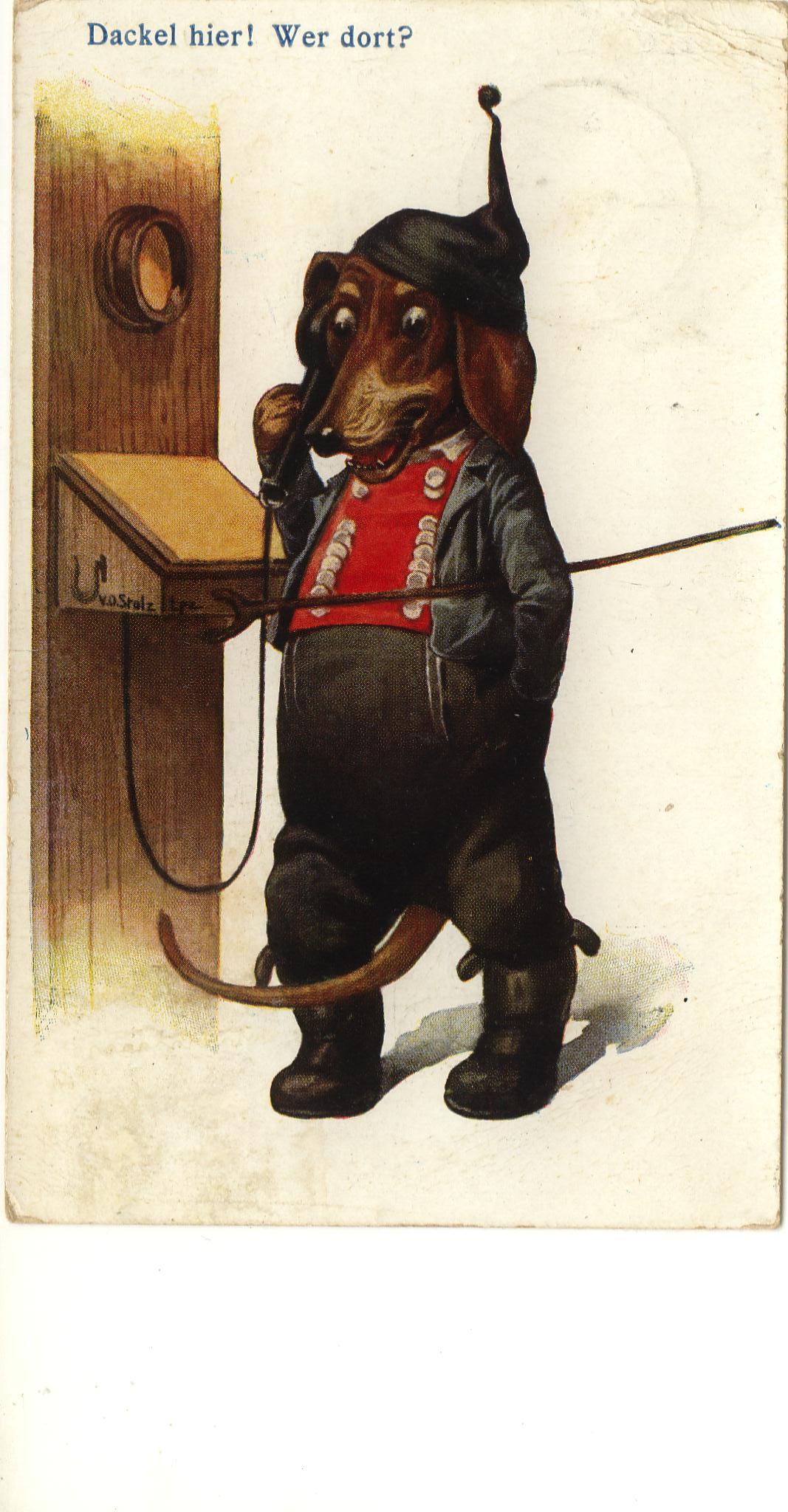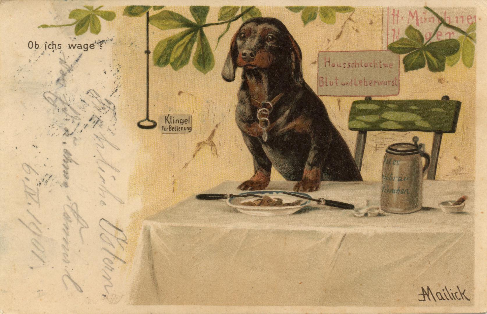 Irgendwie glaube ich, daß dieser Dackel entweder ein Freß - oder ein Alkohol-Problem hat - was hat sich wohl der Künstler bei dieser Karte gedacht?