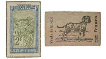 Von Madagaskar gibt es auch seltenes Briefmarken-Notgeld, einige Briefmarken aus dem Satz Michel-Nr. 74-90 von 1908 (Europäer in der Sänfte, Sisalpflanze) kleben auf einem Karton, der auf der Rückseite einen Hund zeigt.