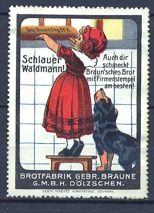 Hier noch ein ebay Angebot aus den USA, eine Werbemarke mit Hundemotiv.