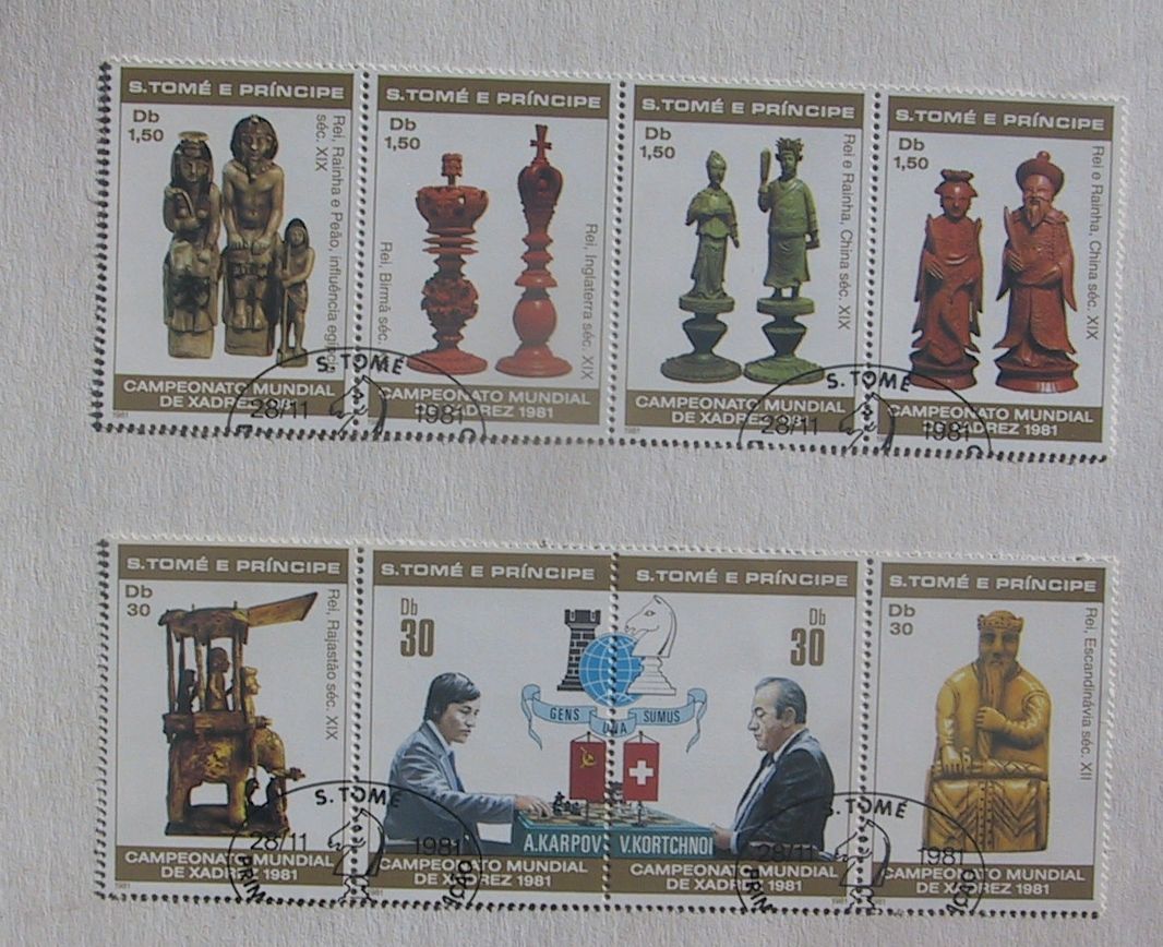 Ich kann noch einige Marken mit Schachmotiv aus St. Thome zeigen, die aus Anlaß der Weltmeisterschaft im Jahr 1981 ausgegeben wurden.