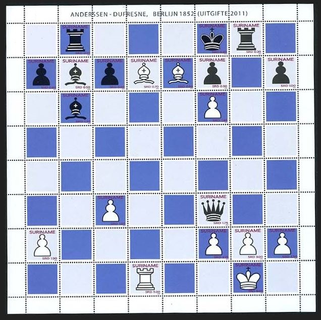 Eine Marke aus Surinam 2011 zeigt ein interessantes Spiel von Andersen gegen Durfresne 1852 in Berlin. Auch das Spiel kann nachgespielt werden.