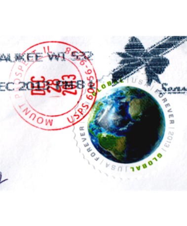 Eine runde Marke, zuerst dachte ich gleich an Fußball, aber die Marke zeigt die Erdkugel mit Inschrift: Global USA forever, wobei dieses "forever" wohl bedeutet, daß die Marke immer gültig sein wird, auch wenn sich das Porto ändern wird. Die deshalb nicht angegebene Nominale war zur Zeit der Ausgabe 1,10 US-$.