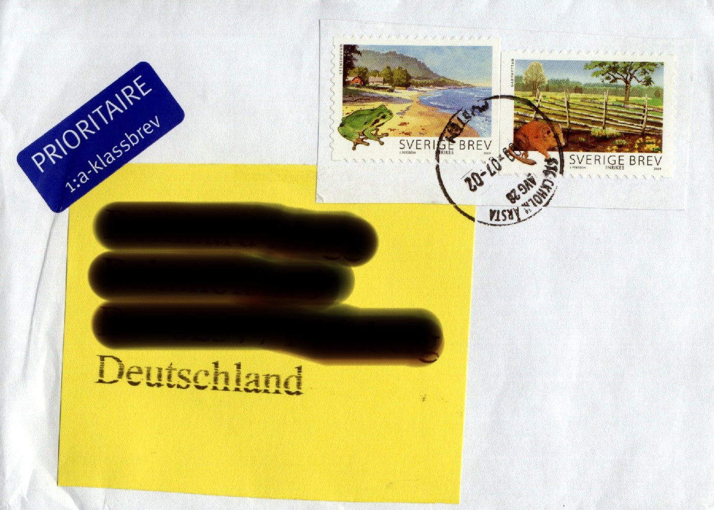 Bei diesem Brief aus Schweden kommen sofort Urlaubsgefühle auf, obwohl Frösche am Strand etwas ungewöhnlich sind, Krabben kann ich mir da eher vorstellen. Möchte aber auf keinen von beiden beim Baden rauftreten.