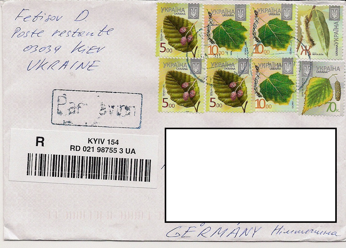 Hier ein eingeschriebener Luftpostbrief aus Kiew. Der Brief ist mit verschiedenen Dauermarken der aktuellen Serie Bäume frankiert: