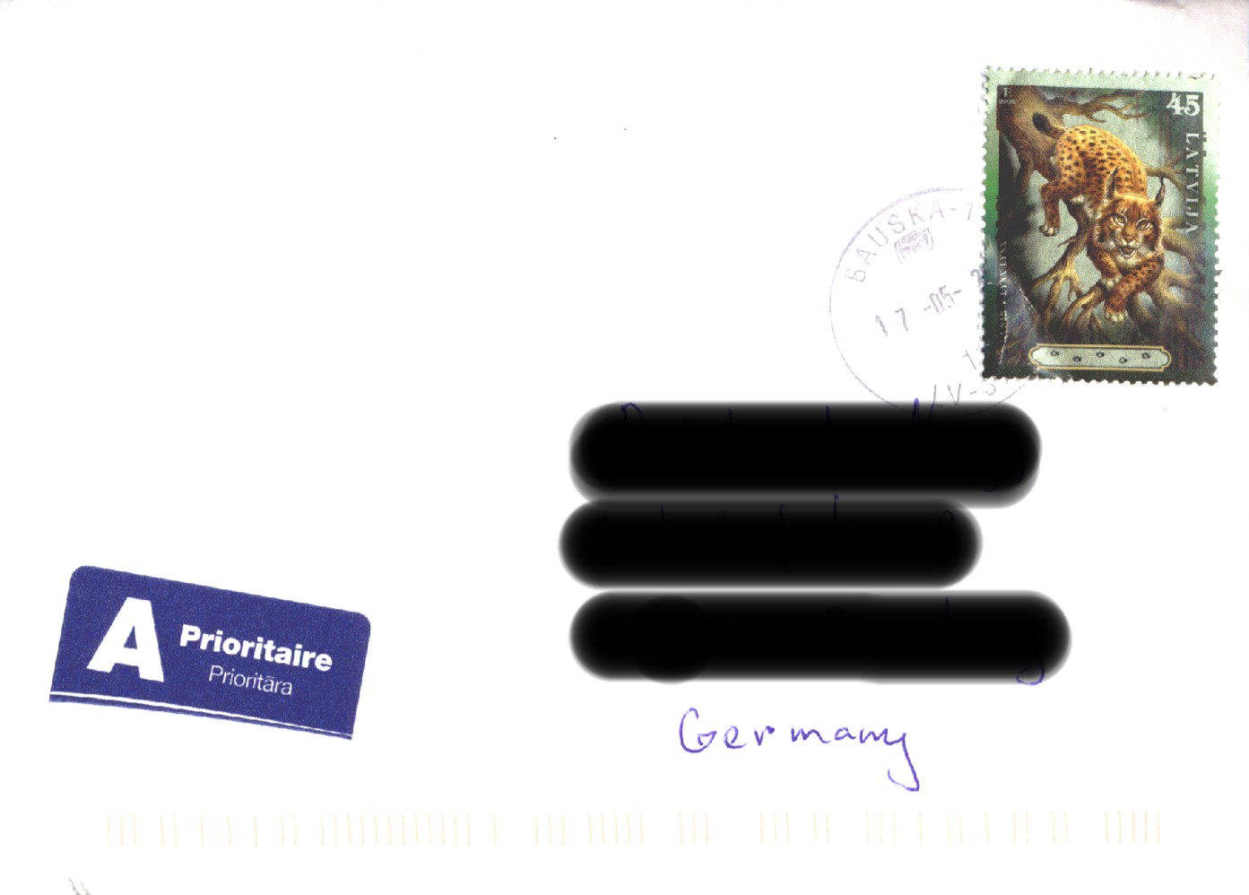 Bei diesem Brief aus Lettland kam mir der Luchs auf der Marke so vor, wie wenn er mir jeden Augenblick mitten ins Gesicht springen würde, eine ziemlich realistische Zeichnung. Abgestempelt in Bauska, leider hat die Marke unten links einen größeren Eckknick. :(
