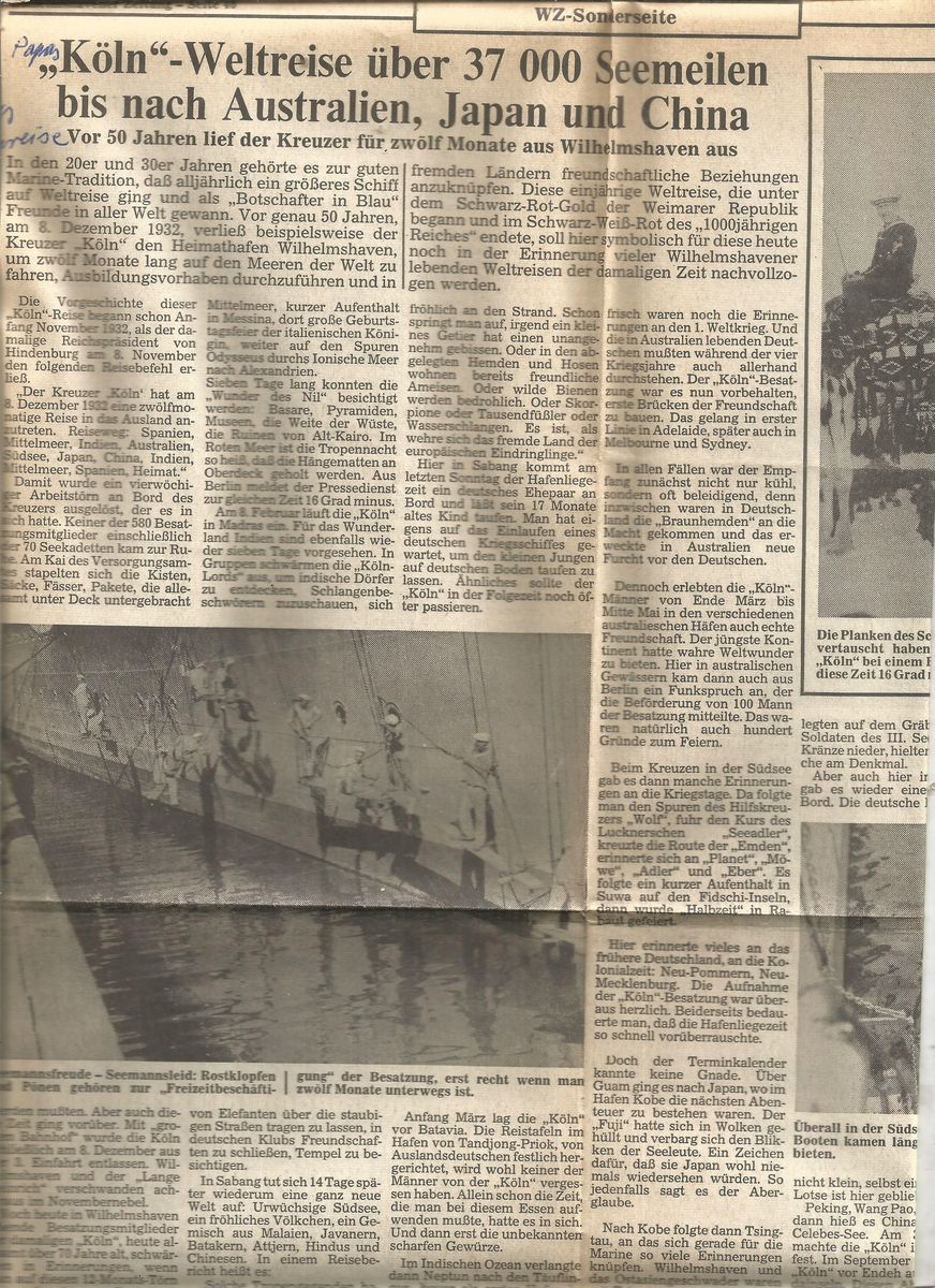 Endlich haben die Berliner Flohmärkte wieder geöffnet und die "Jagd" nach philatelistischem Beutegut ist wieder möglich. Einen Beleg, den ich heute aus einer Nachlaßkiste gefischt habe, möchte ich Euch vorstellen. Es handelt sich um einen Briefumschlag, der am 20. Mai 1933 in Adelaide, South Australia, aufgegeben worden ist. Adressat ist der Obermaschinist August Krüger, der sich zu dieser Zeit an Bord des deutschen Kreuzers "Köln" befand. Das Kriegsschiff war am 8. Dezember 1932 zu einer 37.000 Seemeilen langen Weltreise aufgebrochen, die es über das Mittelmeer nach Indien, Australien, die Südsee, Japan und China und zurück nach Deutschland führte. Am 23. Juli 1933 erreichte der Brief Guam, das Schiff hatte aber bereits abgelegt. Von Guam wurde er nach Shanghai weitergeleitet - auch dort war die "Köln" bereits wieder in See gestochen. Den handschriftlichen chinesischen Postvermerk in Grüner Farbe kann ich nicht entziffern. Am 9. September kam der Brief in Sumatra an. Dort lagerte er mehrere Tage. Aus einem handschriftlichen Vermerk geht hervor, dass die Sendung am 20. September 1933 nach dem Einlaufen der "Köln" ihren Empfänger tatsächlich erreicht hat. Für mich ist es faszinierend, welche Mühe sich die Postverwaltungen der Länder gemacht haben, damit ein Brief seinen Empfänger erreichen konnte.