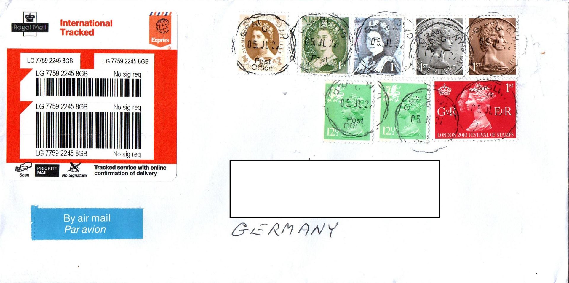 hier noch ein Brief aus gleicher Quelle, Die "Queens" oben stammen offenbar aus einem Markenheftchen, es handelt sich um einen Zusammendruck. Unten unter anderem zwei walisische Machin-Regionalmarken.
