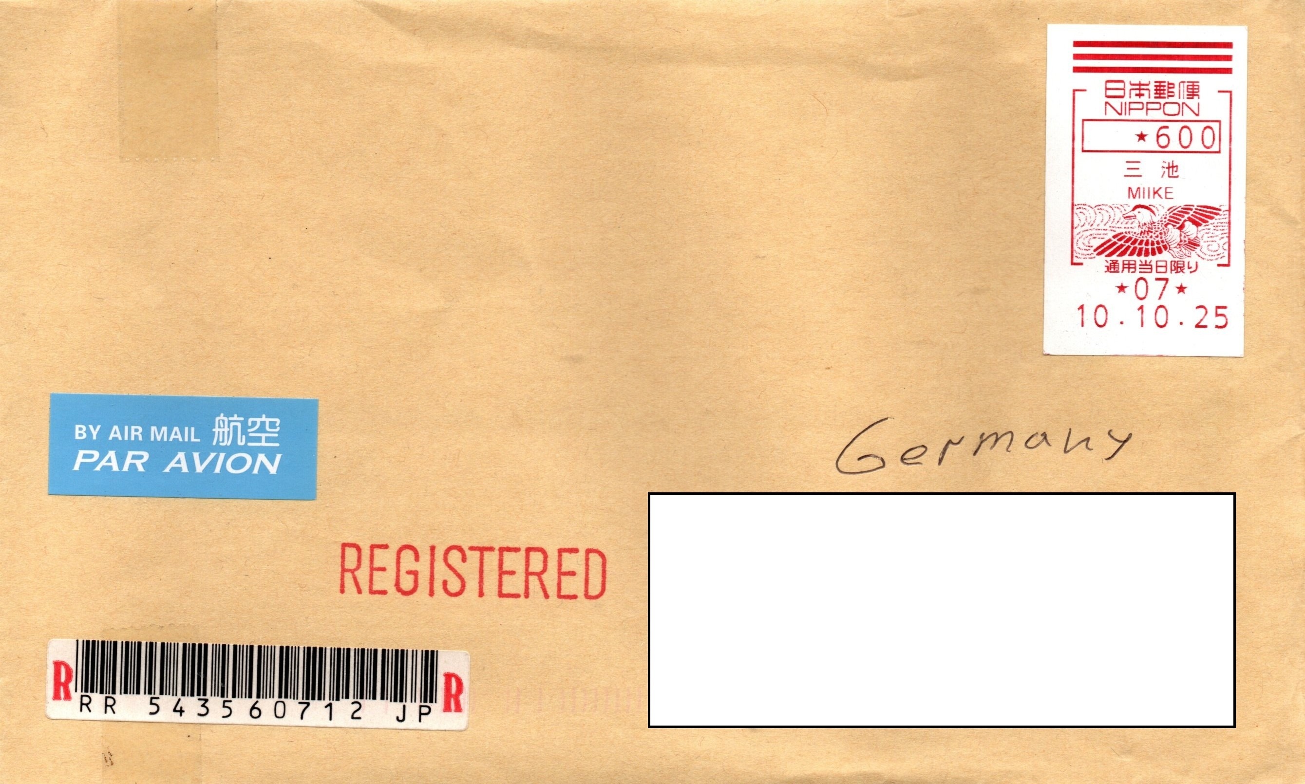 eben gerade brachte mir der Briefträger Post aus Japan. Obwohl Japan ja jedes Jahr extrem viele Neuheiten (inkl. Präfekturmarken) auf den Markt wirft war die Sendung mit einer Automatenmarke (?), vermutlich eine FRAMA-Automarkenmarke frankiert.