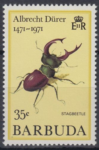 Zum 500. Geburtstag sollte in Barbuda, einer Nebeninsel von Antigua, ein 4-teiliger Satz erscheinen. Aber die Regierung von Barbuda kündigte den Vertrag mit der Agentur, der die Vertreibung der Marken von Barbuda oblag, zum 15. August 1971. Dennoch wurde die nächste Ausgabe (Nr. 99-102 Weihnachten vom 4.10.71) für offiziell erklärt, angeblich aber nicht die Ausgabe zum 500. Geburtstag Dürers (Nr. 103-106 vom 7.12.71). Auf einer Auktion tauchte dieser Satz auch in geschnittener Erhaltung (Proof = Muster) auf.