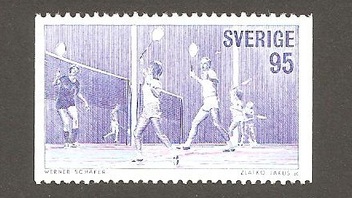 Nach der Haltung zu urteilen, schlägt er gerade auf. Schau Dir doch nur einmal den Schläger an - der ist nie und nimmer ein Badmintonschläger. Hätte vom Ausgabeanlass gut gepasst, da Badminton 1992 in Barcelona erstmals olympisch wurde. Bei der rechten Marke bin ich noch am grübeln. Die könnte evtl. einen Badmintonspieler zeigen. Leider ist kein Federball mit abgebildet. Ich müßte mal schauen welcher Ausgabeanlass bestand, vvlt hilft das weiter...