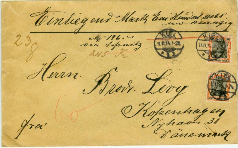 Schaue hier ein Wertbrief aus Kiel nach Kopenhagen, Sendet am 11.11.1914. Wert 196,00 Mark (245 Fr), 23 Gram. Porto 30 Pf. für Brief (20+10) zwischen 20 und 40 Gram, Einschreibegebühr 20 Pf. und Wertgebühr 8 Pf. je 240 Mark erhöht bis 10 Pf. Zusammen 60 Pf.