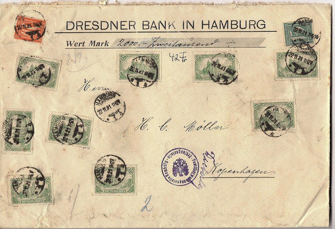 heute zeige ich ein "Handtuch." Es handelt sich um einen Wertbrief mit 2.000 Mark und 237g Gewicht aus Hamburg nach Kopenhagen vom 22.11.1921.