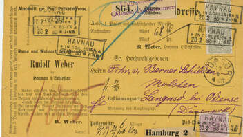 Haynau in Schlesien bis Grenztaxpunkt Woyens in Schleswig > 83 Meilen was der 4. Entfernungszone entsprach >hier waren für ein Paket mit 5-6 kg 80 Pfennig zu entrichten.
