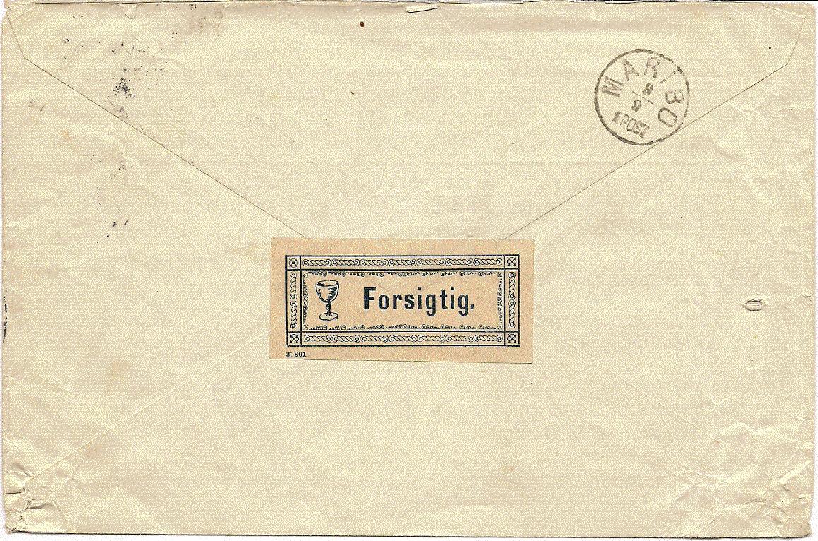 Der Brief trägt darüber hinaus vorderseitig einen deutschsprachigen Aufkleber "Vorsichtig" auf der Rückseite das dänische Pendant "Forsigtig"