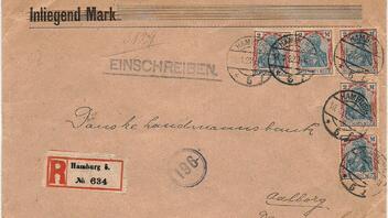 schon länger nichts mehr eingestellt. Hier also ein eingeschriebener Auslandsbrief der 3. Gewichtstufe aus Hamburg nach Aalborg. Am 10.1.22 beim Postamt Hamburg 5 abgestempelt, Valutakontrolle passiert und am 12.1.22 in Aalborg spätabends angekommen und vermutlich am Folgetag zugestellt. Porto 4 Mark + 2x2 Mark für die 3. Gewichtstufe plus 2 Mark Einschreibegebühr = 10 Mark (1.1.22 bis 30.6.22).