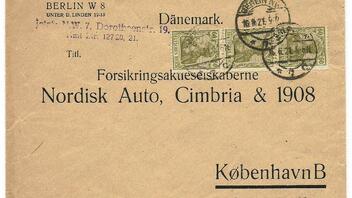 Heute ein Brief der 2. Gewichtsstufe aus Berlin an die dänische Versicherungsgesellschaft "Nordisk Auto, Cimbria & 1908" in Kopenhagen vom 16.8.21. Rückseitig Ankunftsstempel "København B. 1. OMB 18.8.21"
