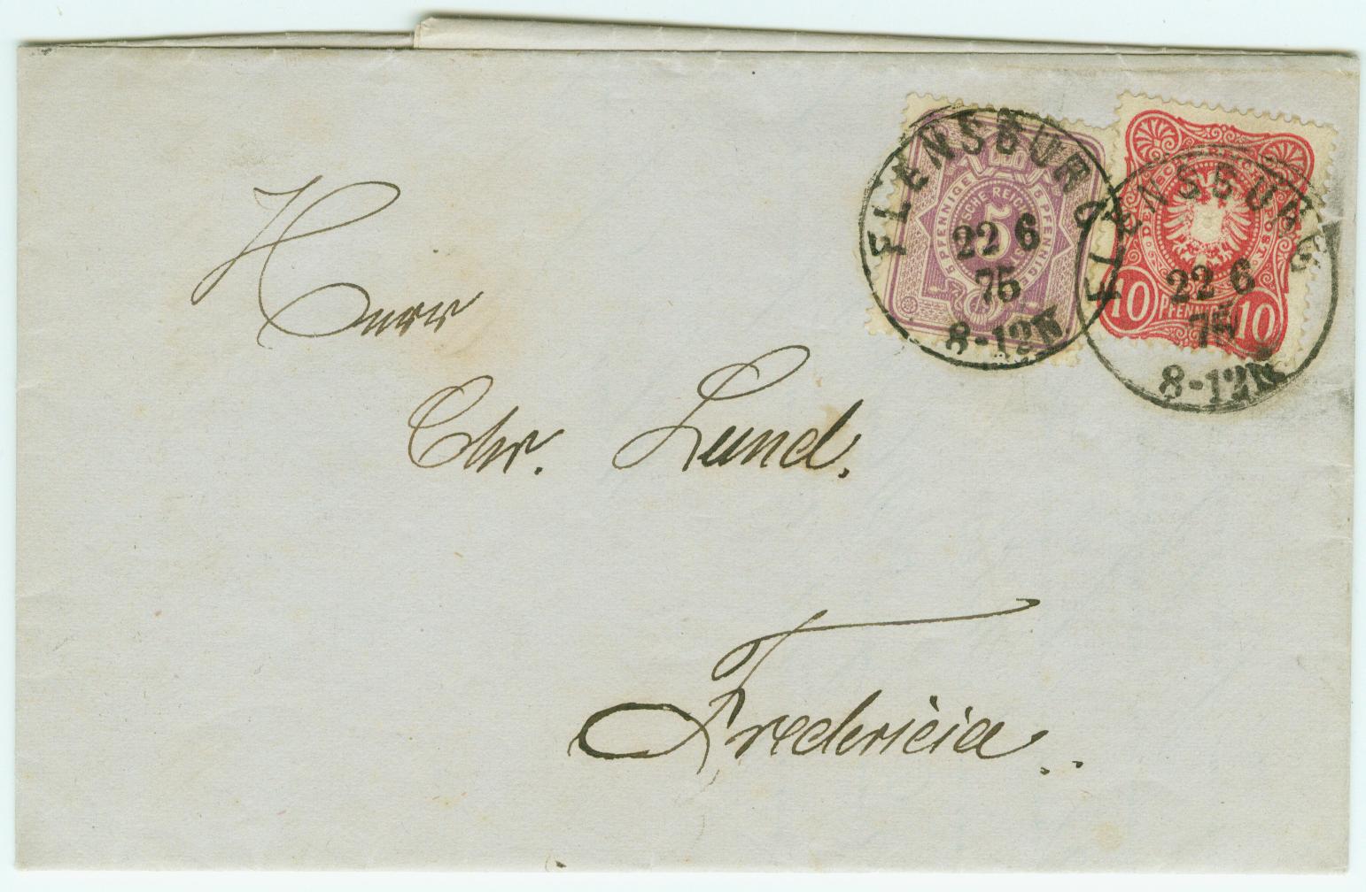 Schaue hier ein 15 Pf. Brief aus Flensburg nach Fredericia, sendet am 22.6.1875.