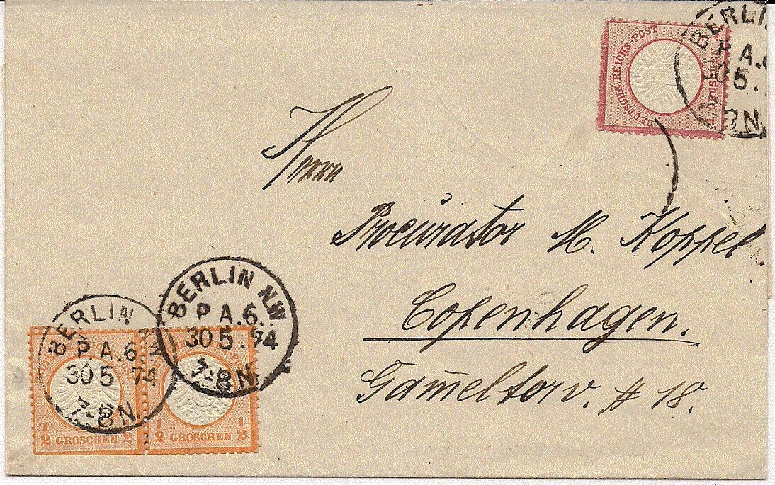 Marken entwertet mit dem Steggitterstempel Hanau 2b vom 23.11.23. Rückseitig Kopenhagener Ankunftstempel vom 25.11.23