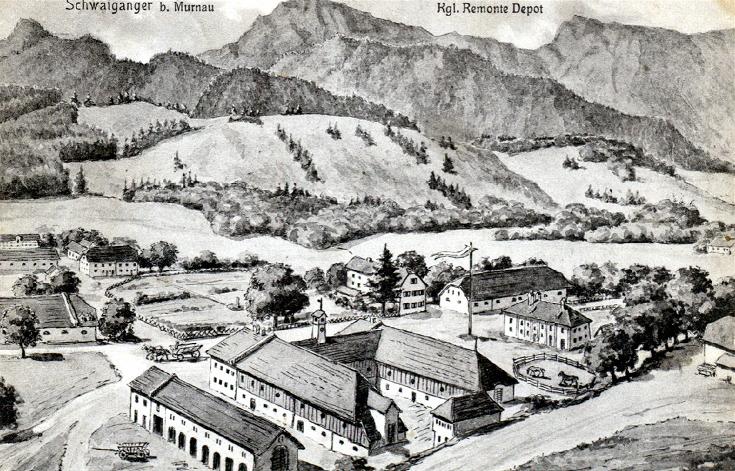 Schwaiganger bei Murnau, das ehemalige Remonte-Depot, in dem früher die Pferde für die Soldaten gezüchtet wurden, mit Bergpanorama.