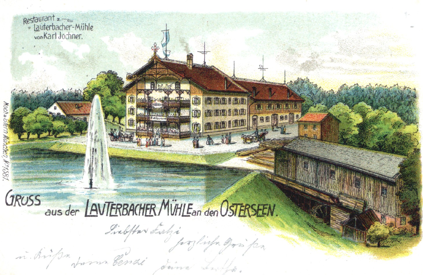 Die Lauterbacher Mühle war um 1900 ein bekanntes Restaurant mit einer wunderschönen Aussicht auf die Osterseen und das Gebirgs-Panorama.