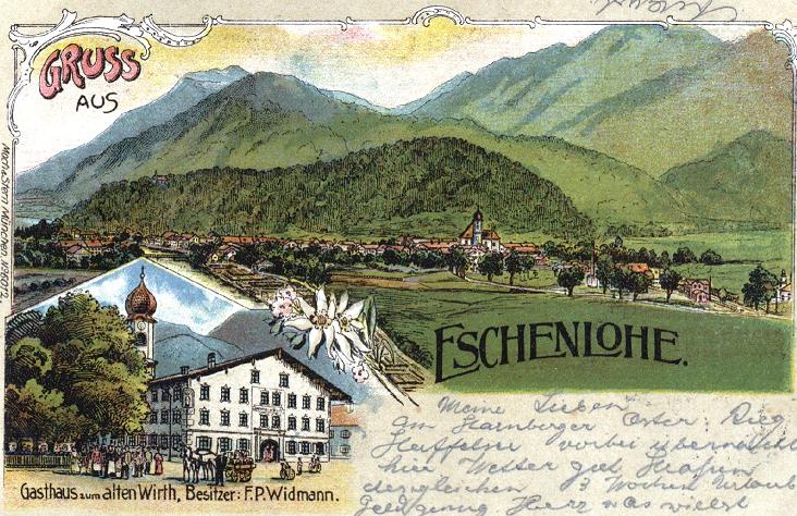 Eine alte Lithographie aus Eschenlohe von 1901, einem kleinen Dorf vor Garmisch-Partenkirchen an der Loisach. Mit einer alten Pferdekutsche vor dem Gasthaus zum Alten Wirt.