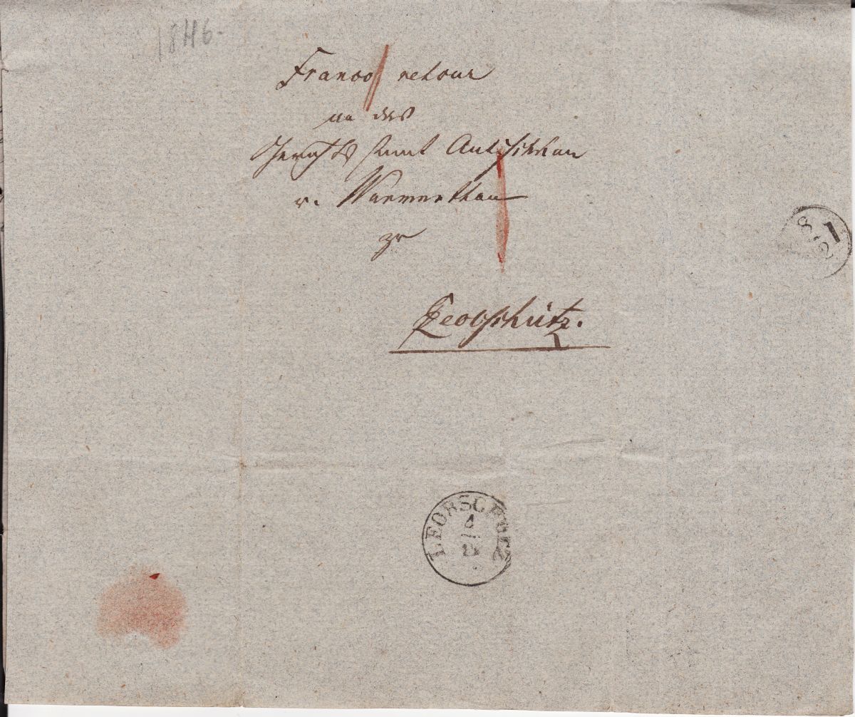 ich habe einen Post-Behändigungsschein vom 05.12.1846. Der vereidigte Postbote hat die Behändigung der zu zu stellenden Verfügung mit dem Amtssiegel von Cosel und seiner Unterschrift bestätigt.