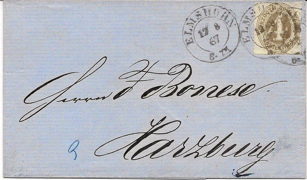 Dieser Brief zeigt das 3 Sgr. Porto in den DÖPV in Form eines Dreierstreifens der 1 1/3 Sch. Marke (Mi. SH23). Rückseitig ist der fast unleserliche Ankunftstempel Harzburg abgeschlagen.