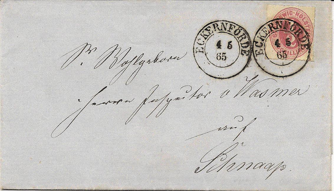 2 Schillinge waren das Porto für den einfachen Brief nach Dänemark ab dem 1.8.1865. Umgekehrt galten 6 Sk. (bzw. 10 Sk.für den unfrankierten Brief). Mit diesem Postvertrag wurde auch die erste Grenzportovereinbarung getroffen.
