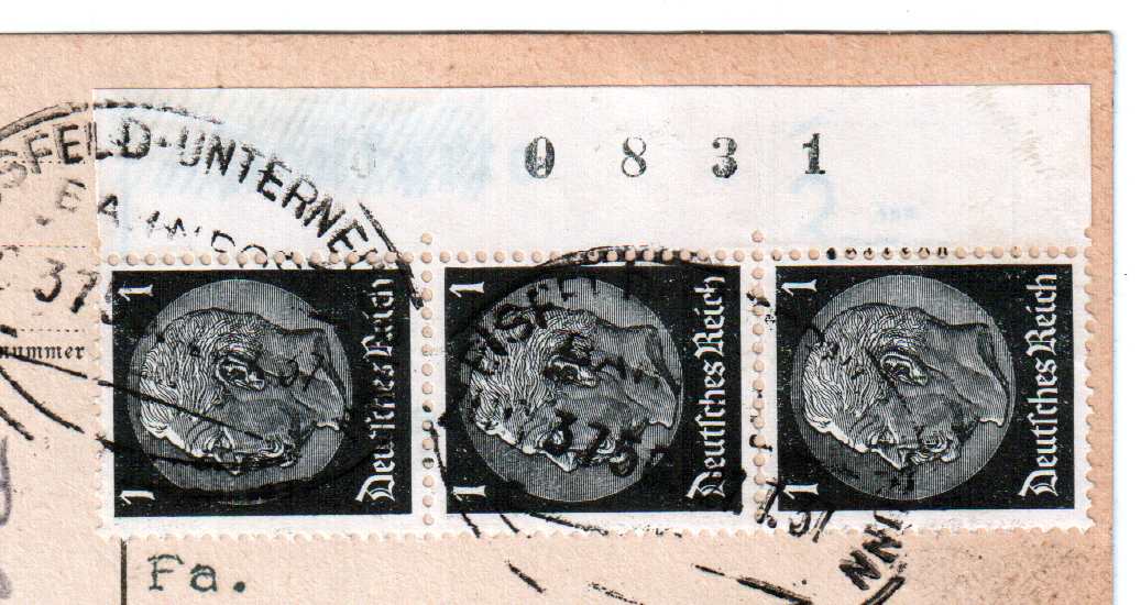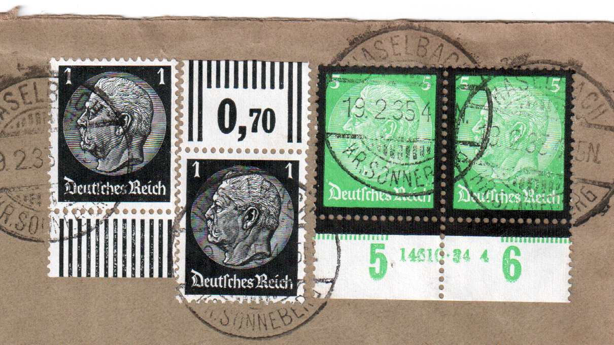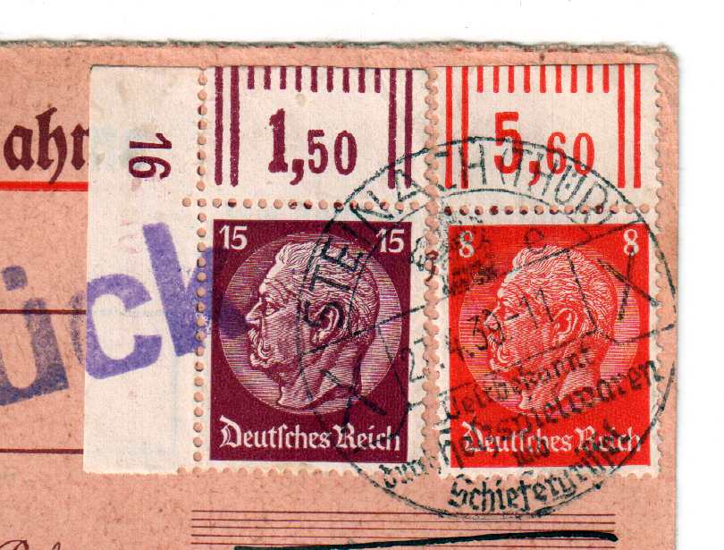 Die 5 Pf Hindenburg in MiF liegt dann bei 15 EUR und die Nachnahmekarte mit den beiden Oberrändern liegt auch bei etwa 15 EUR, die Verwendung nicht berücksichtigt.